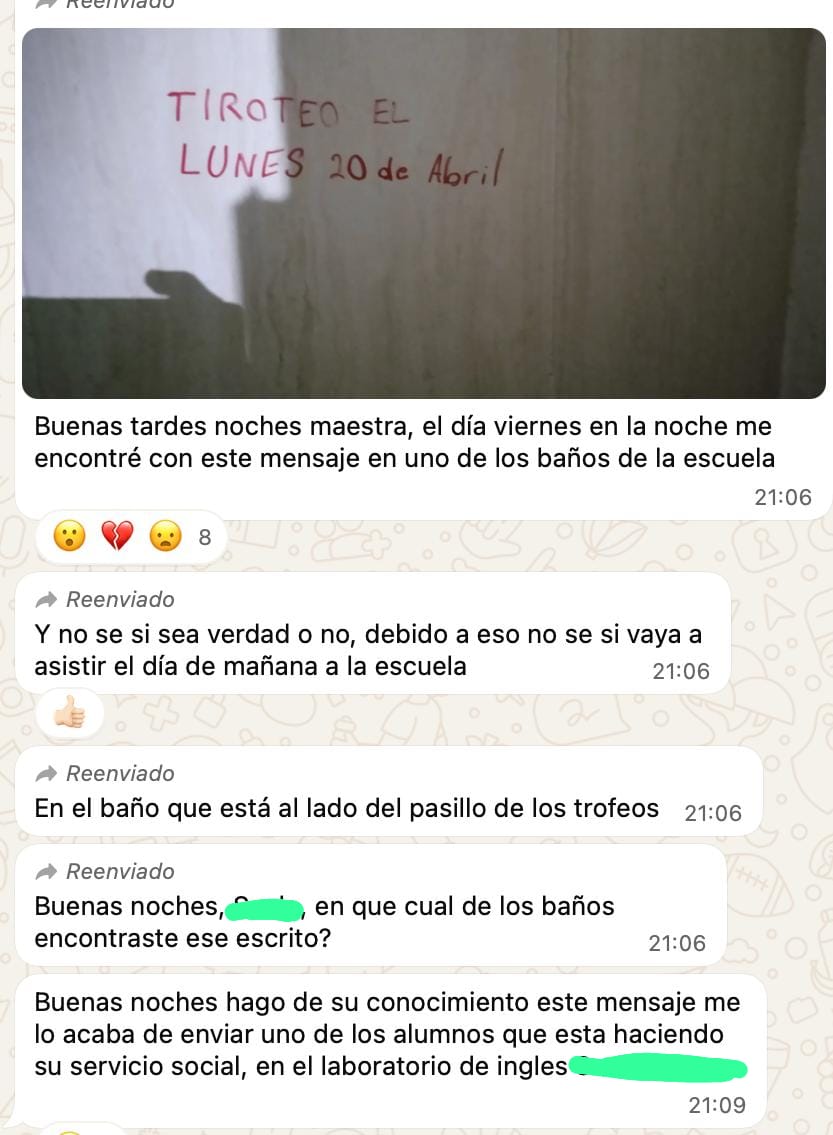 En el CBTIS 121, se difundió una imagen de un mensaje presuntamente escrito con marcador rojo en el baño, en el que se advertía sobre un “tiroteo mañana”, generando alarma entre estudiantes y padres de familia.
