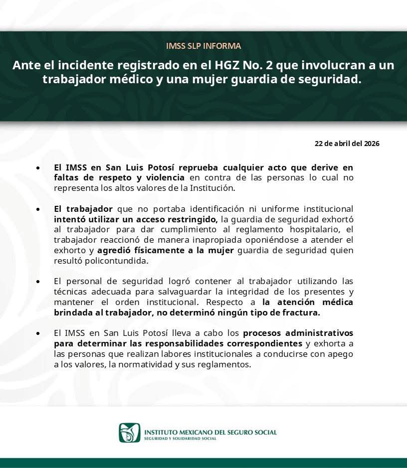 Por su parte, a través de un comunicado con fecha del 22 de abril de 2026, el IMSS SLP ofreció una versión distinta de los hechos. La institución reprobó los actos de violencia, pero puntualizó que, el trabajador involucrado incumplió las normas al no portar identificación ni uniforme institucional e intentar ingresar por un acceso restringido; al ser interceptado por personal de seguridad, presuntamente reaccionó de forma inapropiada y agredió físicamente a una guardia. Por lo anterior, la institución afirmó que el personal de seguridad aplicó técnicas de contención adecuadas para salvaguardar la integridad de los presentes y que, tras una revisión médica al trabajador, no se detectaron fracturas.