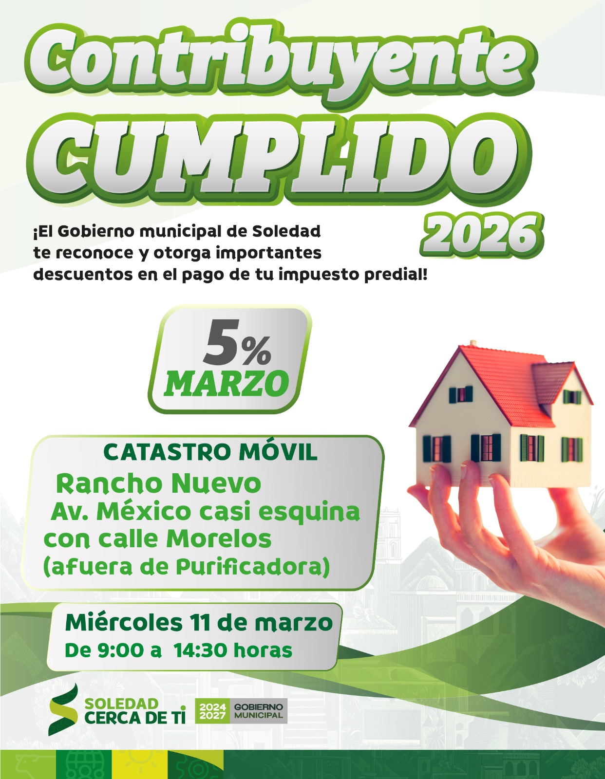 Durante el mes de marzo continúa vigente el descuento del 5 por ciento en el pago del impuesto predial en el municipio de Soledad de Graciano Sánchez, beneficio dirigido a las y los contribuyentes que aún no han realizado este trámite correspondiente al presente ejercicio fiscal.